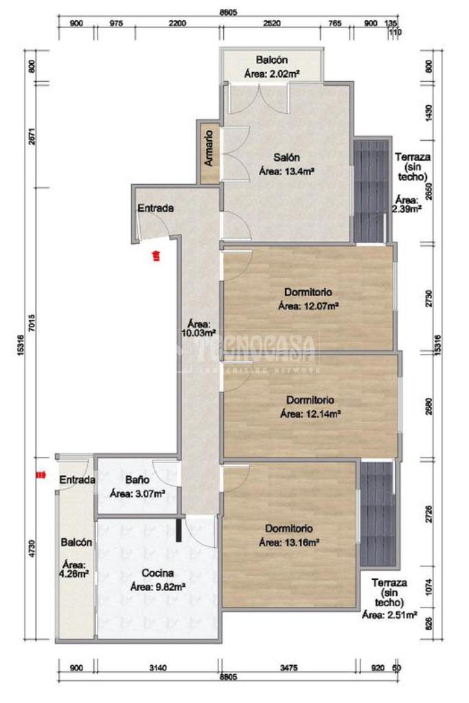 - 3 habitaciones, todas ellas muy amplias, 2 de ellas con terrazas individuales.